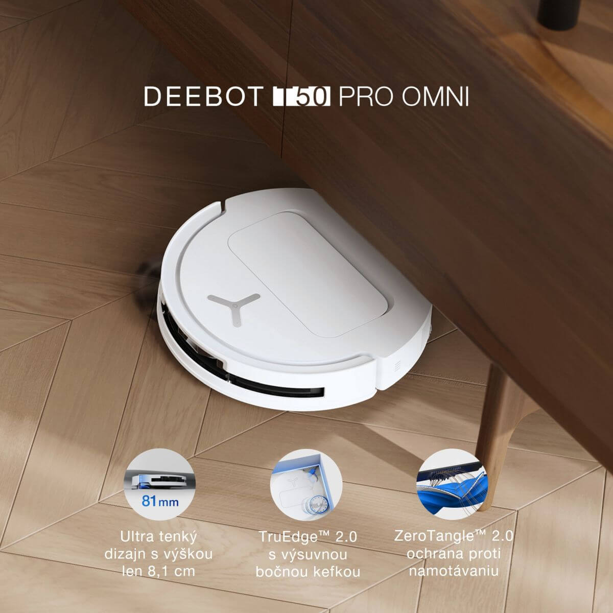Robotický vysáč ECOVACS DEEBOT T50 PRO OMNI vybavený umelou inteligenciou premieňa robotické čistenie na bezpečnejšie a plynulejšie než kedykoľvek predtým.