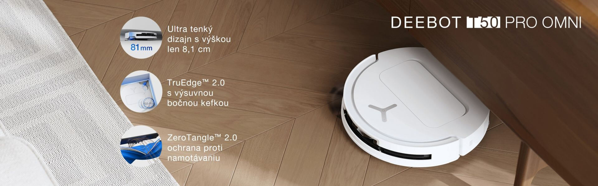 Robotický vysávač ECOVACS DEEBOT T50 PRO OMNI sa vďaka ultra tenkému dizajnu dostane úplne všade. Plne zabudovaný dToF LiDAR umožnil zminimalizovať jeho výšku len na neuveriteľných 8,1 cm. Tento kompaktný dizajn v kombinácii s kamerou a senzorom s 3D štruktúrovaným svetlom poháňanými umelou inteligenciou zaisťuje komplexné čistenie aj v slabo osvetlených alebo úzkych priestoroch. Aj pod posteľou, aj pod nízkym nábytkom, aj na iných ťažko dostupných miestach.
