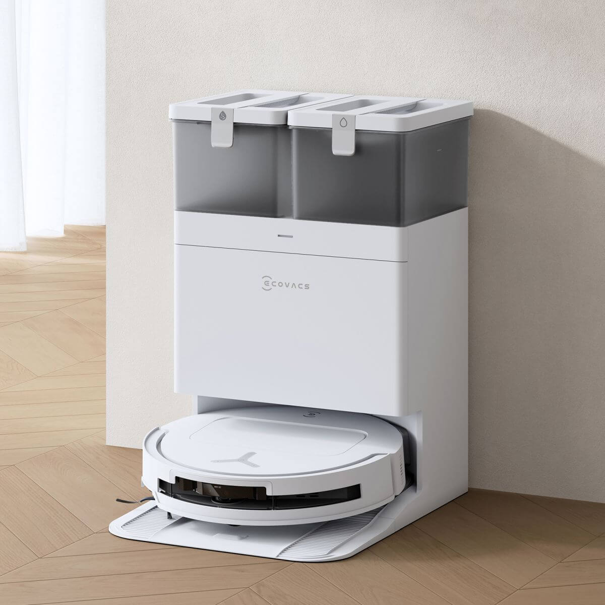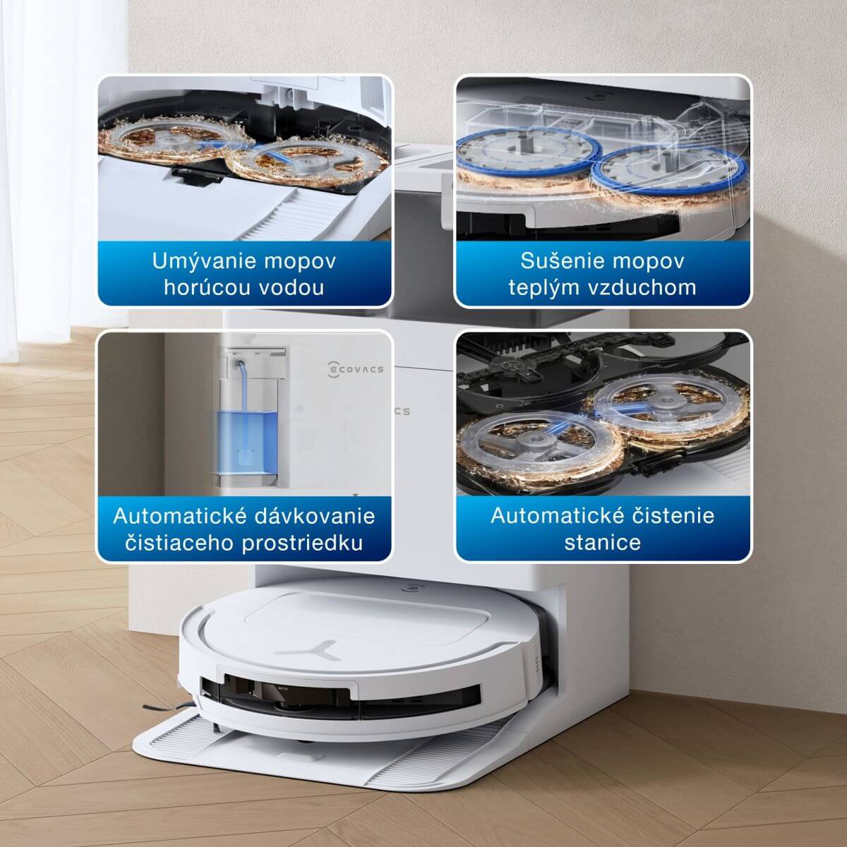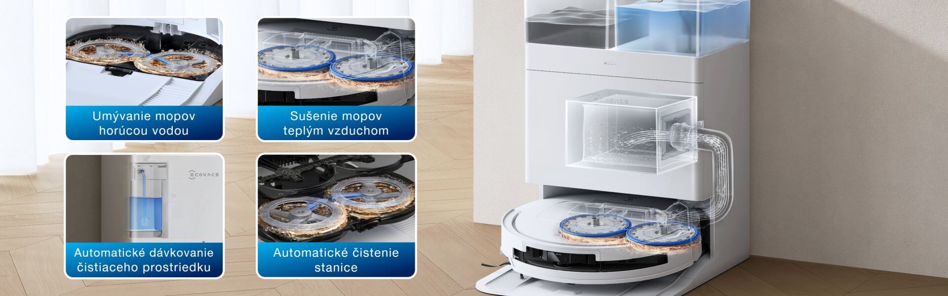All-in-one OMNI stanica s technológiou samočistenia zabezpečuje bezúdržbové a hygienické upratovanie bez baktérií a zápachu. Automaticky vyprázdni prach zo zásobníka robota, doplní mu vodu a navyše presne nadávkuje čistiaci prostriedok. Absolútnu bezúdržbovosť umocní aj automatické čistenie dvoch rotujúcich mopov horúcou vodou a ich následné vysušenie teplým vzduchom.