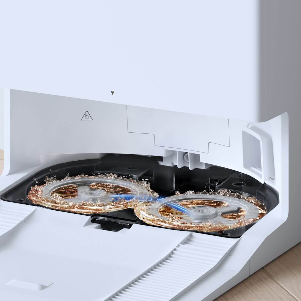 Dva rotujúce mopy robotického vysávača ECOVACS DEEBOT T50 PRO OMNI sa v stanici opakovane umývajú horúcou vodou s teplotou až 75 °C, takže budú vždy hygienicky čisté. Horúca voda účinne rozpustí mastnotu a odstráni všetky nečistoty prilepené na mopoch.