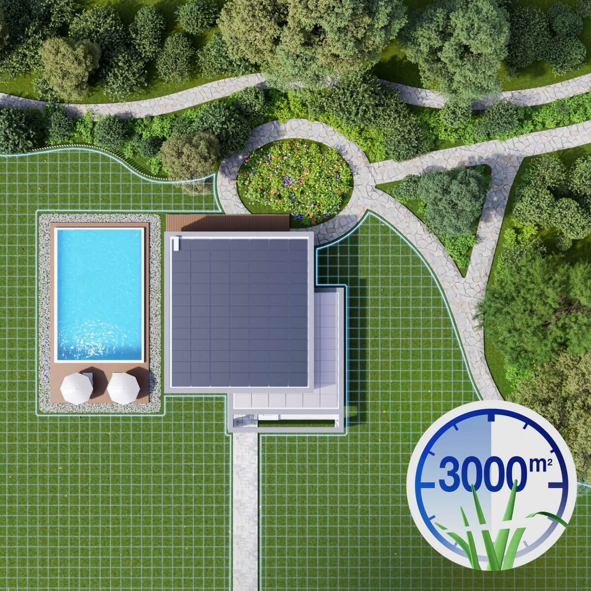 Robotická kosačka ECOVACS GOAT A3000 LiDAR PRO s podporou AI Deep Learning dokáže v reálnom čase rozlíšiť trávnatú plochu od netrávnatej. Ak rozozná zjazdné ohraničenie trávnika, ako je napríklad dlažba, bude jednou stranou prechádzať priamo po nej, a tak na okrajoch nezanechá ani jedno steblo nepokosenej trávy.